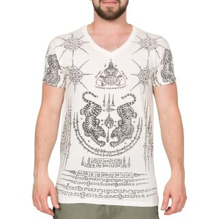 Das Shirt zeigt die berühmten und heiligen Yantra-Tätowierung, die von verschiedenen asiatischen religiösen Gruppen und Kulturen über Jahrhunderte hinweg praktiziert wurde. Sak Yant Tattoos wurden in den letzten Jahrzehnten von verschiedenen Prominenten, wie beispielsweise Angelina Jolie populär gemacht.