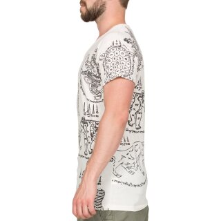 Das Shirt zeigt die berühmten und heiligen Yantra-Tätowierung, die von verschiedenen asiatischen religiösen Gruppen und Kulturen über Jahrhunderte hinweg praktiziert wurde. Sak Yant Tattoos wurden in den letzten Jahrzehnten von verschiedenen Prominenten, wie beispielsweise Angelina Jolie populär gemacht.